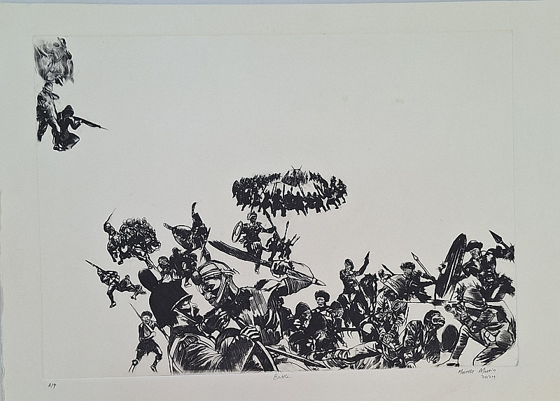 “Battle and War” is a series of dry-point prints that explores the devastating impact of both