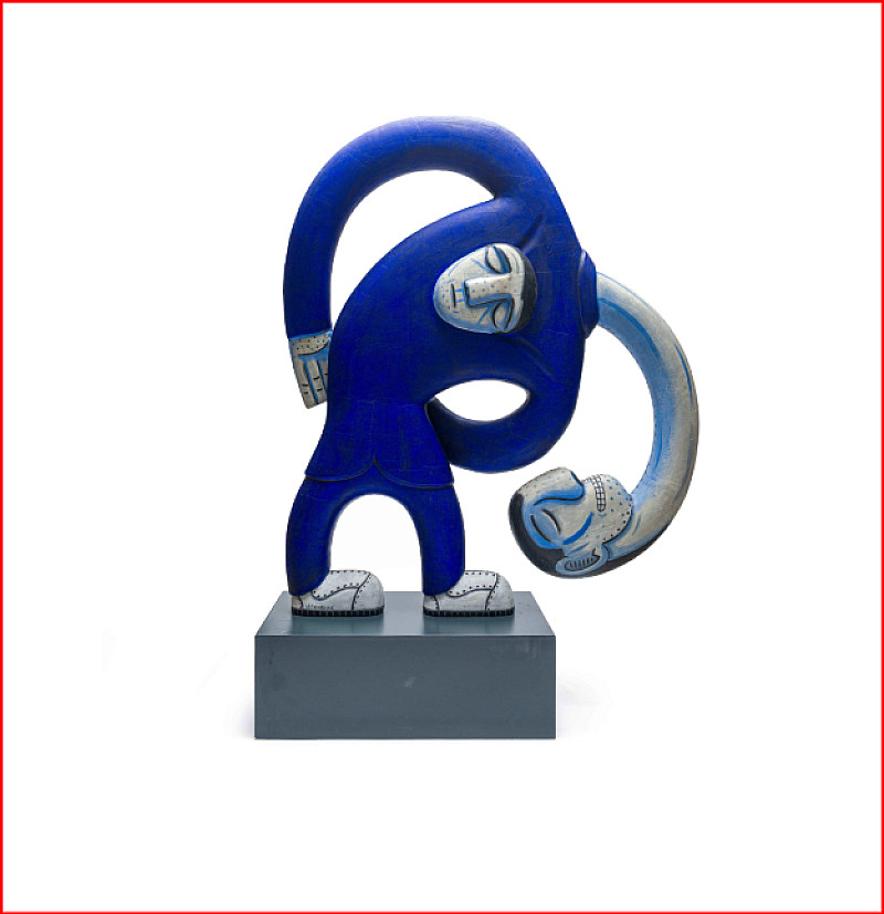 In the 1990s Norman Catherine experimented with large-scale fibreglass sculptural figures such as the present lot. Hazel Friedman notes: “Norman Catherine’s life-size sculptures have broken free from the canvas and the confines of the relief backdrop asserting themselves in a free-standing space and dwarfing the artist himself. But their exaggerated scale acquires an added surrealness through the absurd masks they wear and their distorted body parts and gestures. Despite their imposing size, these sculptures are not the scary monsters of Catherine’s early work. They exist alongside the artist, sometimes infiltrating his space, but no longer threatening his psyche.