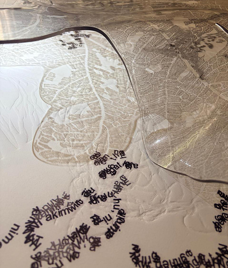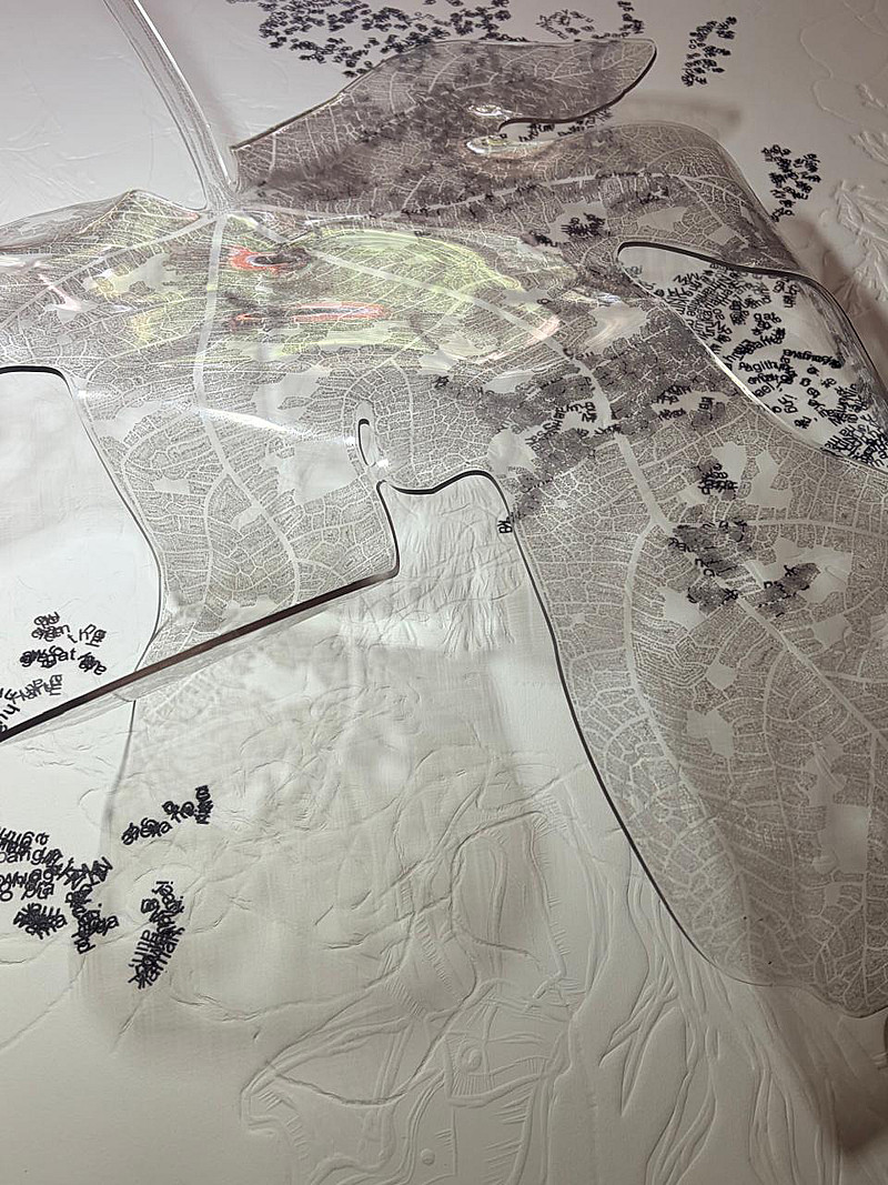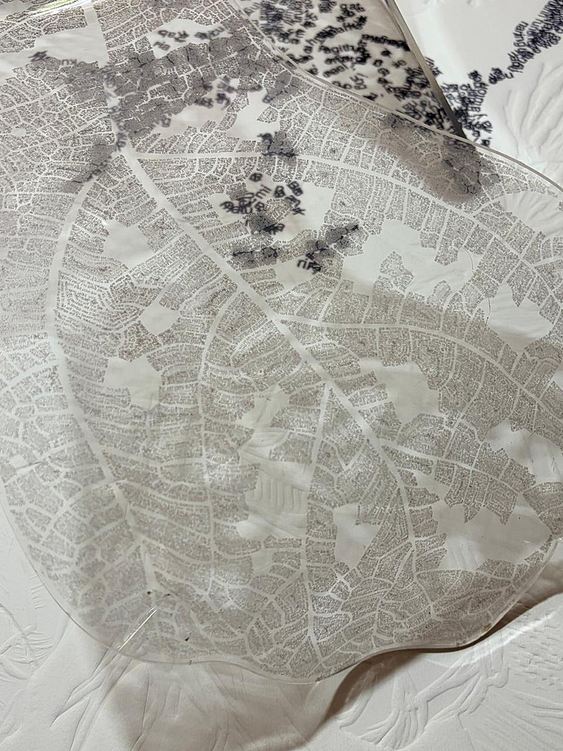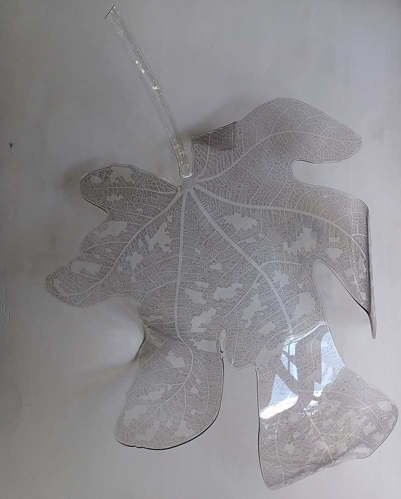 Fig Leaf consists of digital text printed on transparent plexiglass. Text following the precision of the intricate veins in a fig leaf. The image contains the entire books of Psalms, Proverbs, Ecclesiastes and Song of Solomon. Poetical language describing the blueprint for a disciplined life.