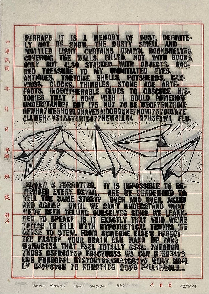 The text I often incorporate in my artworks indicate thoughts and interpretations, the presence of cognitive activity, when I don’t have to think about what my hands are busy with.  A kind of meditation, unrelated to the practical thinking about the task at hand. Conceptual input into the art-making, when the medium and process is under control.  The making becomes automatic and the mind is free to roam a personal history.   It doesn't necessarily have to be readable, just recognisable as writing.  Asemic writing, abstract and alluding to knowledge transferred.  Disappointing to a viewer who painstakingly deciphers the texture just to find the artist asks more questions than offer answers.   When working on these art-works, I attempt to capture flow of consciousness, grasping as many fleeting thoughts as possible, to create a texture of text.