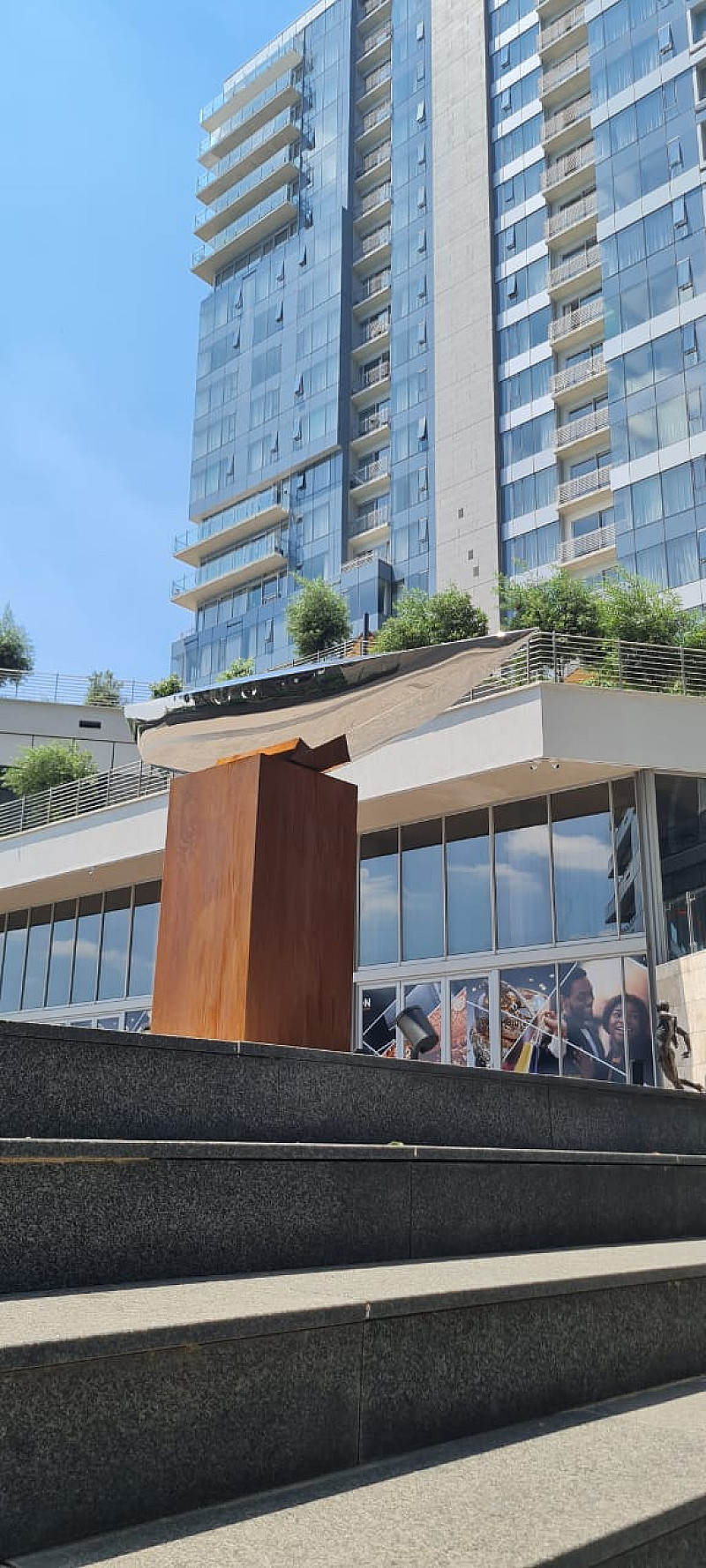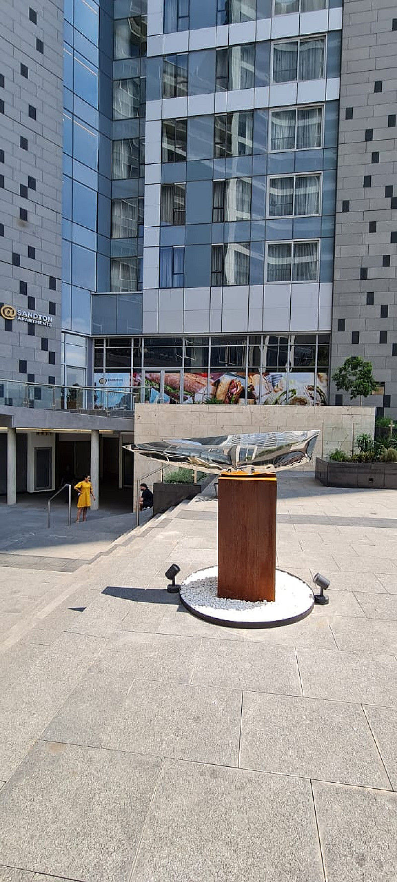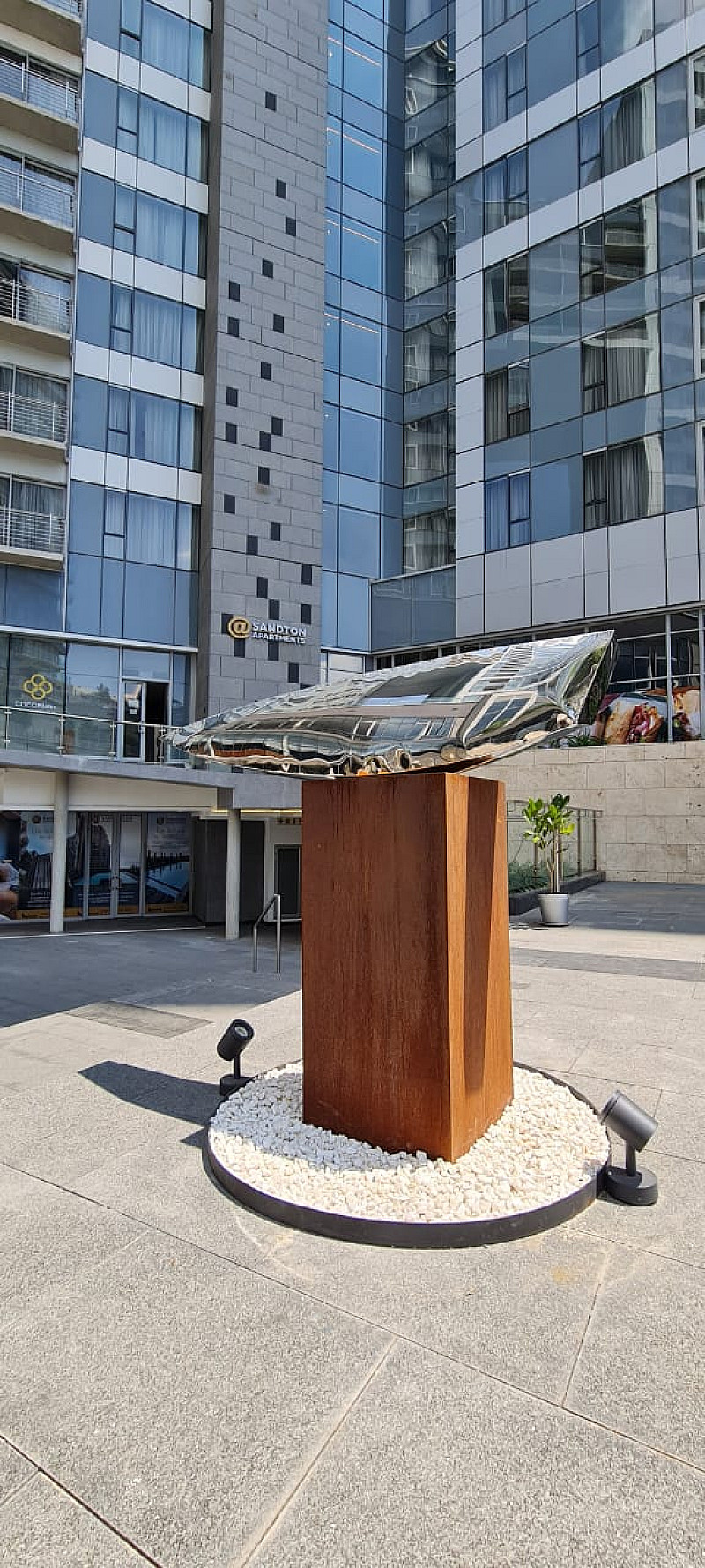 Mirror polished air inflated stainless steel on a naturally painted steel base