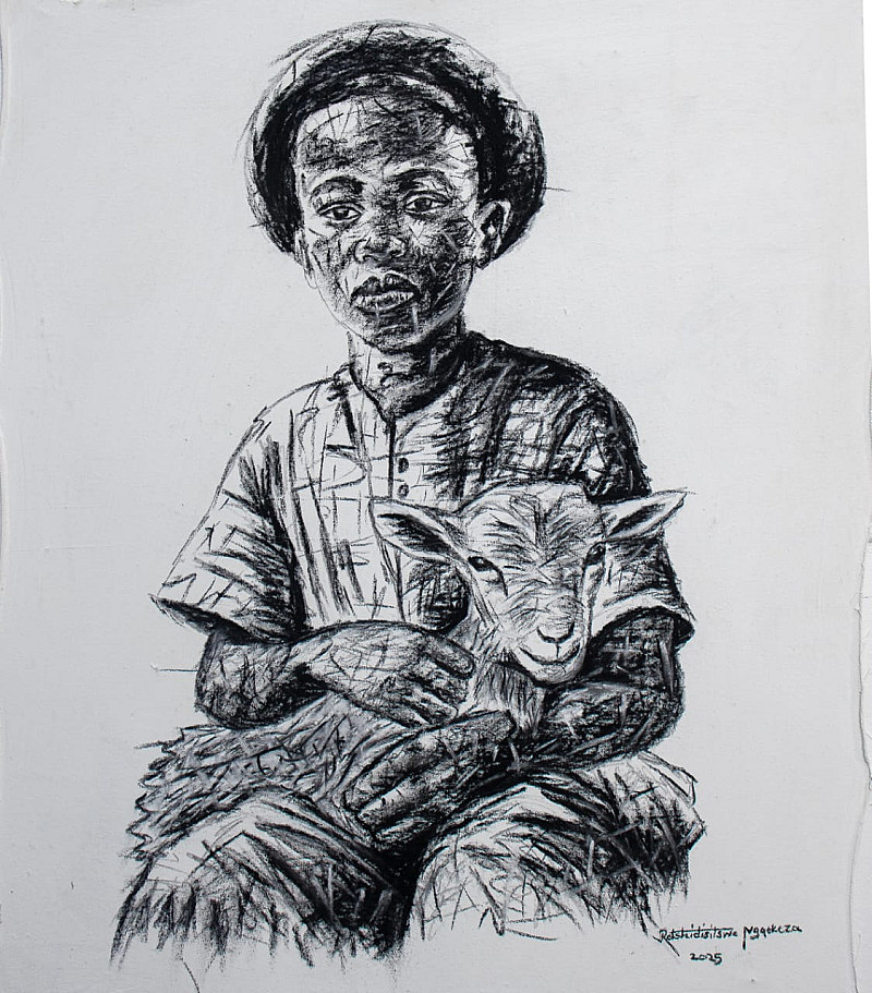 My artistic journey is deeply rooted in my Sotho heritage, spirituality, and the profound narratives that shape our identity. 'Lerato la Modisana le Ditema tsa Bophelo' translates to 'The Love of the Shepherd and the Patterns of Life,' a title that encapsulates the essence of this series. Through this body of work, I explore the spiritual and cultural connections between humanity, nature, and the unseen forces that guide us. This series is a relection of my upbringing as a shepherd , where I learned the values of patience, care, and resilience. The shepherd igure symbolizes both physical and spiritual guardianship, drawing parallels to our connection with God and the wisdom passed down by our elders. The visual language of Ditema (Sotho traditional patterns) represents the rhythm of life, our joys, struggles, and the unseen hands that shape our destiny. Using charcoal, acrylic, and mixed media, I aim to create a dialogue between realism and abstraction. The intricate patterns, textures, and layered compositions evoke a sense of history, memory, and continuity. My choice of materials mirrors the contrast between the tangible and the spiritual, allowing the viewer to navigate the visible and invisible realms. 'Lerato la Modisana le Ditema tsa Bophelo' is more than a series—it is a journey of self-discovery and healing. Through these works, I honor my past, embrace the present, and envision a future where culture and spirituality coexist harmoniously. Each piece is an invitation to relect on one’s path, guided by love, tradition, and divine purpose. Through this collection, I seek to inspire a deeper understanding of our interconnectedness—between past and present, earth and spirit, love and sacri ice. My work stands as a testimony that art is not only a visual expression but a bridge to something greater than ourselves