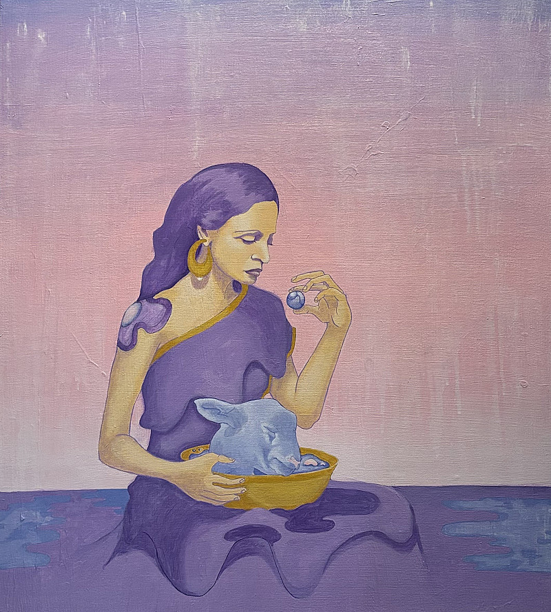 Working with drawing, painting and video, my practice is characterized by deep personal exploration connected to childhood, cultural identity, memory, mythology. Core to my practice is drawing and sketching. Ideas from my sketchbook inform both my paintings and video art pieces. As someone born in South Africa but whose identity is closely tied to Indentured labour. I’ve often felt displaced, not African enough for Africa and not Indian enough for India. My work allows me to bridge this divide by drawing inspiration from both Indian and South African culture. Influenced by Surrealism, Early Renaissance paintings, traditional and modern Indian art, and comic books. My work navigates between European and Asian art history by weaving together narratives inspired by allegory, Hindu mythology and folktales which express universal and personal experiences. My art is primarily about escaping the realities of the mundane world and experiencing something dreamlike, born from the imagination.